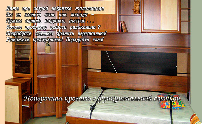 Конструктивные решения позволяют располагать кровать вертикально или горизонтально. Выбор, как правило, диктует само пространство. У того и другого варианта есть свои преимущества. Например, в продолговатом помещении (а таких – большинство в домах массовых сериях) удобнее использовать горизонтальную кровать независимо от ее размера. Будучи открыта, она позволяет свободно передвигаться по комнате даже при наличии мебели у противоположной стены.